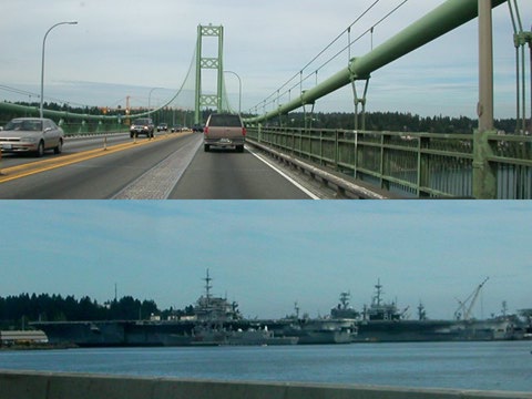 Puget Pix - the Tacoma Narrows bridge, and parked carriers at Bremerton