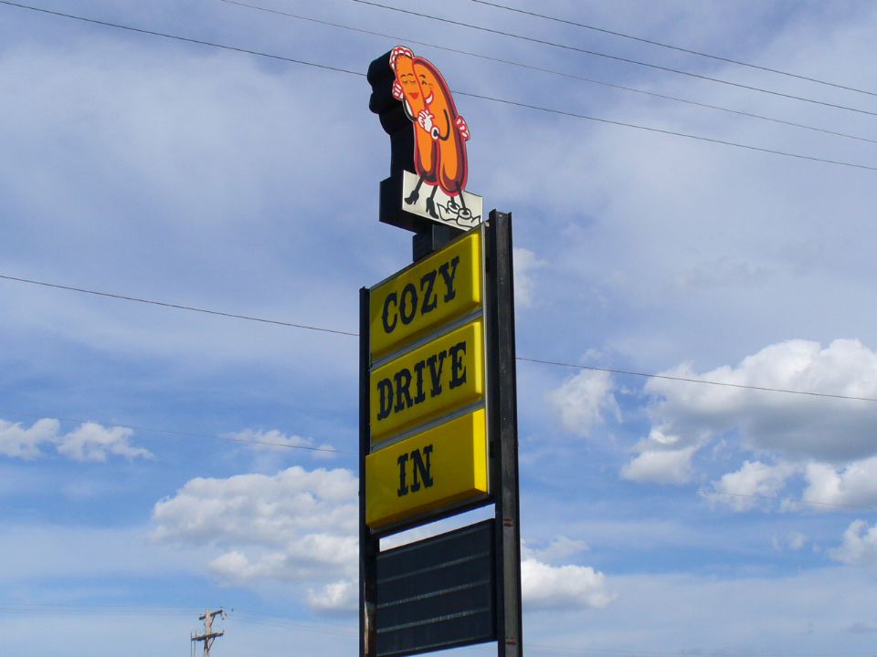 Happy dogs atop the Cozy sign