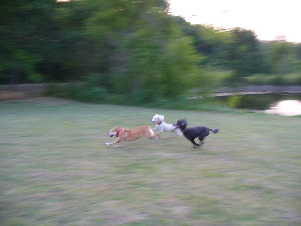 Dogs frolicking in the pasture at hyper-speed