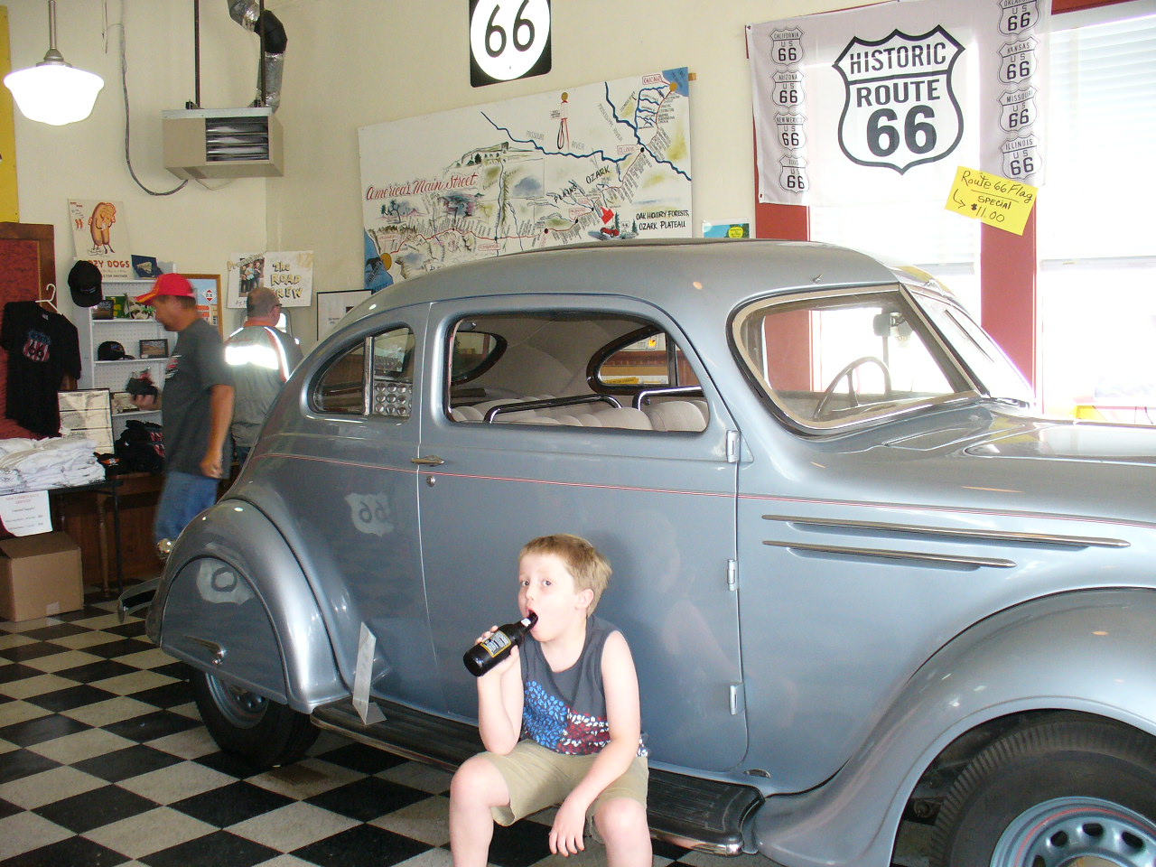 Swigging a "Route Beer" on the fender of a DeSoto - this is the life