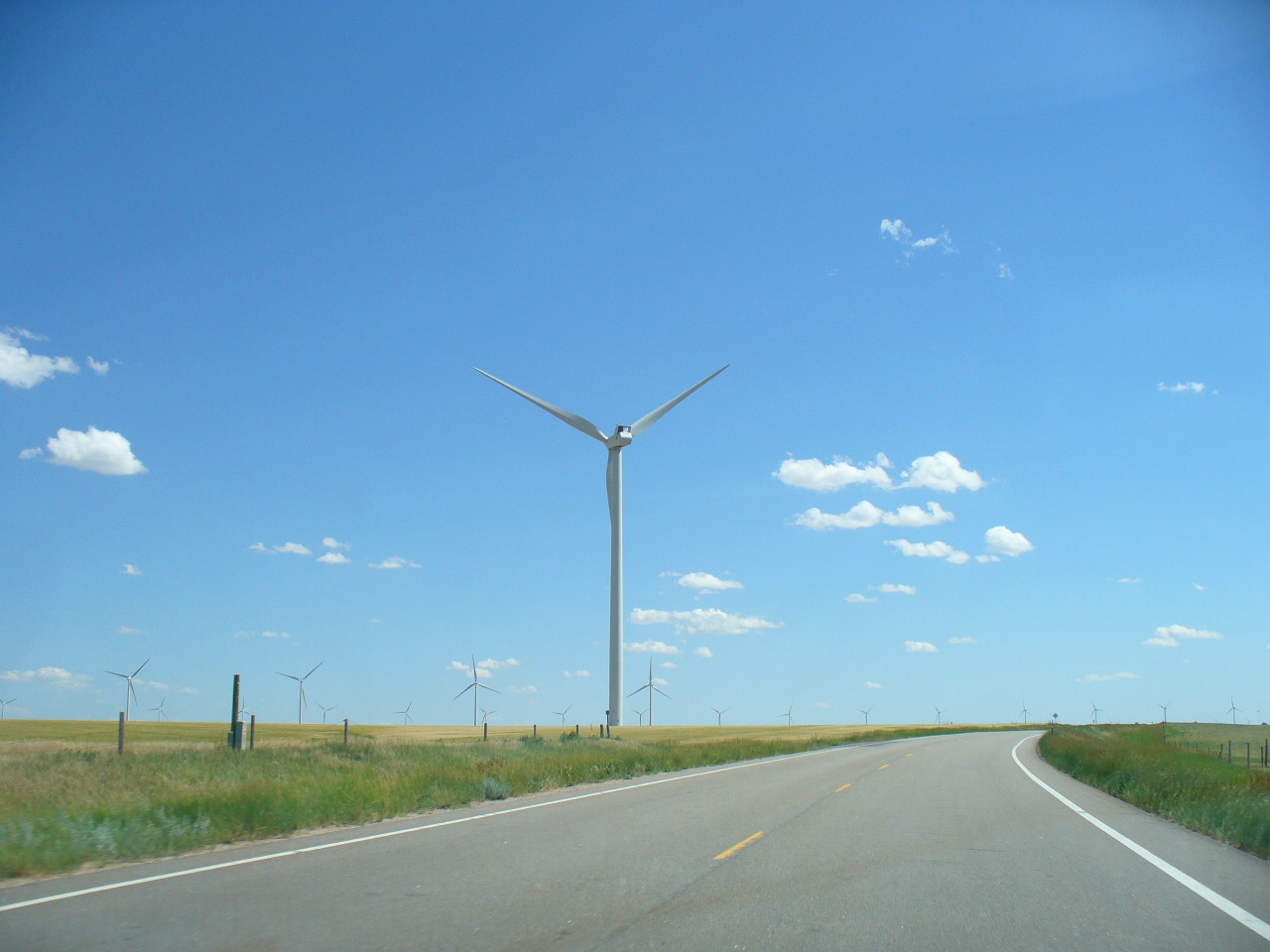 Newer windmills whoosh in the prairie breeze