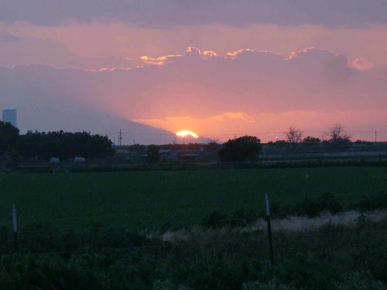 Sunset sky peeks between clouds and mountains